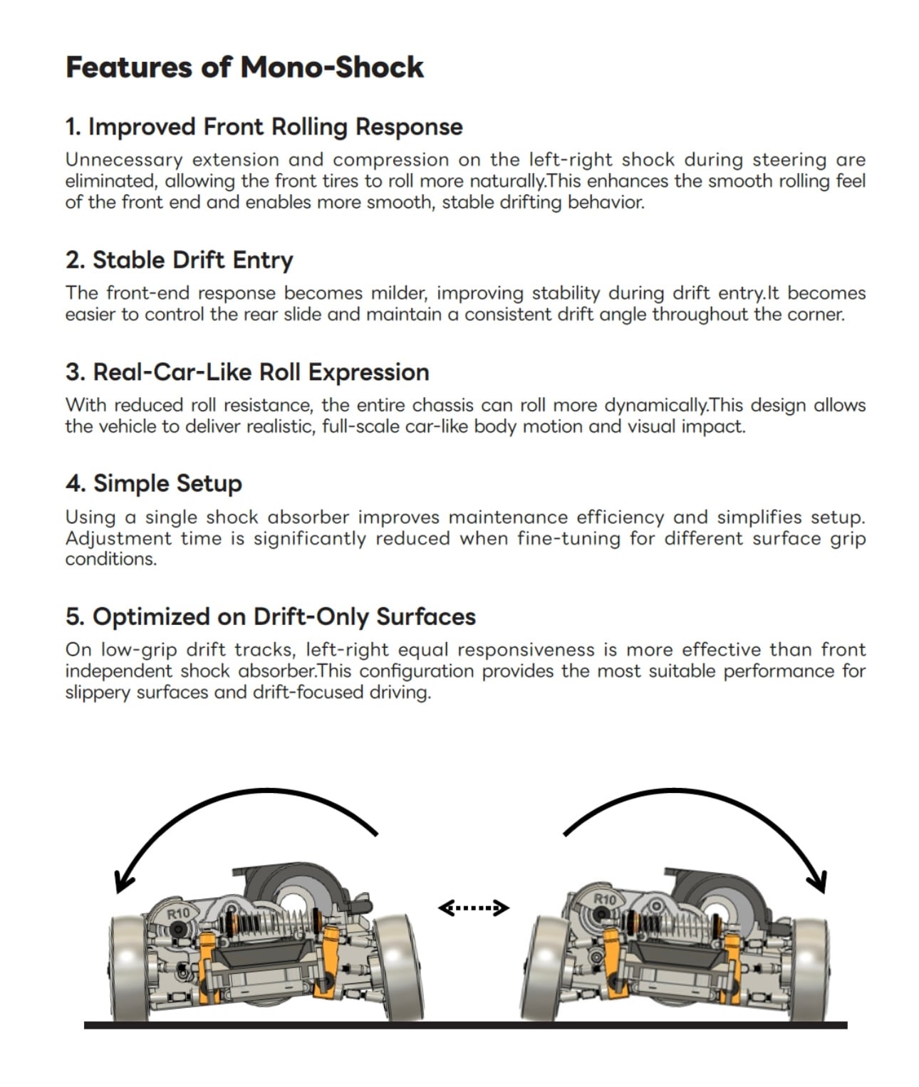 Front Mono Shock Set フロントモノショックセット Option Parts for MRD Series MRD シリーズ用オプションパーツ This unique layout links the left and right suspension with a single shock to eliminate roll resistance, reproducing realistic roll action just like a full-size car.It minimizes toe angle changes during counter-steering, improving the rolling efficiency of the front tires.When initiating drift, initial […]