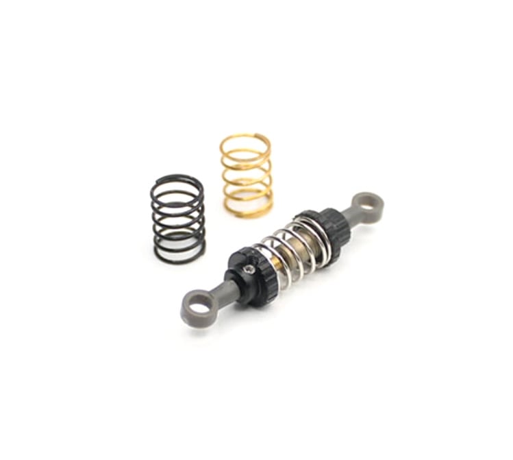 Our Center shock is designed to be easy to adjust, light weight and lower maintenance than your "average" shock. The shock is made with premium components such as hard coated 7075 T6 Alloy Main Body and Titanium Nitride Coated Main Shaft. With this shock design, droop can be adjusted by turning the lower spring perch or shock cap. Additionally, the enclosed grease chamber allows for longer time in between re-builds. This main damper should work not only with our RX28 Kits, but also with the majority of 1/28 scale chassis out there. The shock set comes with all 3 spring options (Black-soft, Silver-Medium, Gold-Hard). We recommend Kyosho 30,000 grease inside the shock.