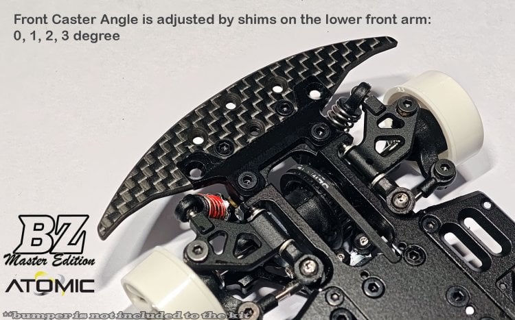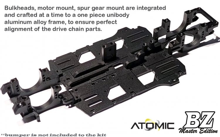 Here we present you with the most advanced of our AWD competition machine BZ Master Edition. After years of experience and listening to racers opinion around the world; We now fully re-design our winning belt drive 4wd chassis What is new in BZ Master: - New main frame which integrated the front and rear bulkhead, spur gear mount, motor mount and the chassis plate. All these parts are crafted in a single 7075 alloy to make sure the perfect alignment of the drive chain parts. - 50:50 mid belt design: equal belt length of front and rear to have more on power steering. - CNC made Ball-head type suspension system; wobble and slop is significantly reduced. - Quick adjustment of the camber angle thru the turnbuckle screw on upper arm. - All suspension arms are made 7075 alloy, provide extra rigidity and stability in large super high-speed tracks. -Active Rear Toe system, easy adjustment of the rear toe angle and you can change the mid corner rear grip of the rear by adding or reduce shims. - Come with aluminium chassis with ability to add side wings and mass weights (optional parts) to reduce the chance of traction roll and add stability - Servo mount is compatible with slim or normal size servo (8.0mm to 11.5mm thick) - 24mm wide battery compatible. - Sway bar system (with bearing support) will be available in options - Front caster angle adjustable (with shims on the lower front arm) - Front width is 74mm with Narrow Wheels (N-8.5mm 0 offset) - Rear width is 76mm with Wide Wheels (W-11mm 0 offset) Buy It Now Model: BZM-KIT Shipping Weight: 200 grams Manufactured by: Atomic